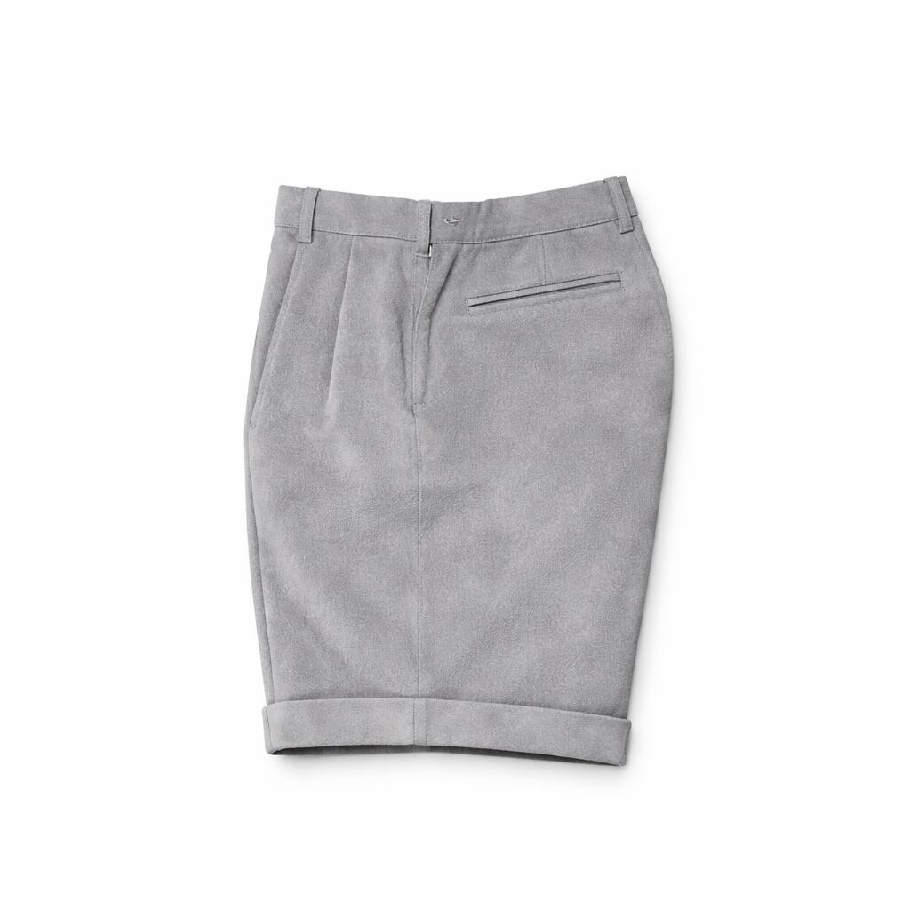 ベースは、2インプリーツのドレストラウザーズ。ショーツ専用に再設計した型紙により、程よいボリュームとすっきりとしたシルエットを両立。